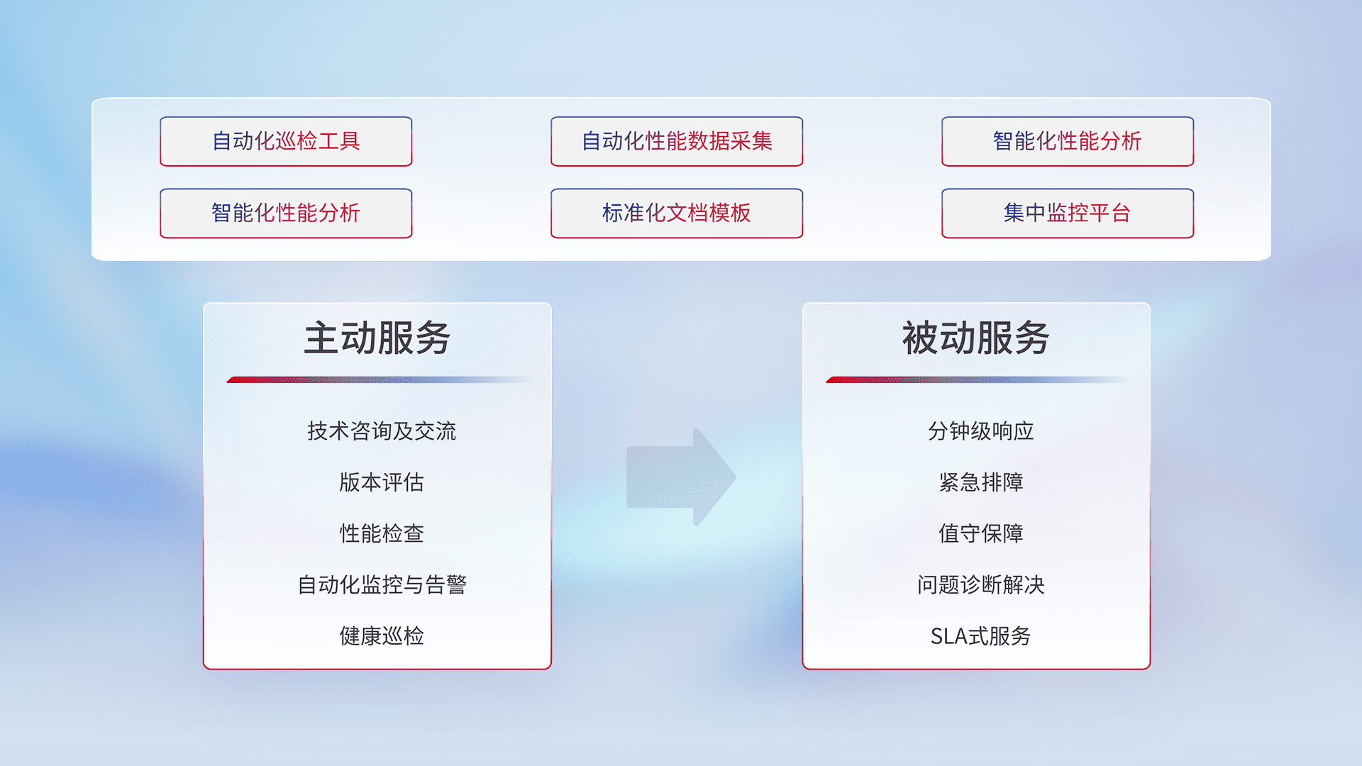 智能化工具和标准化文档,,,,保障服务质量,,提供主动服务(包含技术咨询、、、、版本评估、、、性能检查、、、自动化监控与告警、、健康巡检)和被动服务包含(分钟级响应、、紧急排障、、、、值守保障、、、、问题诊断解决、、、、SLA服务)。。。。